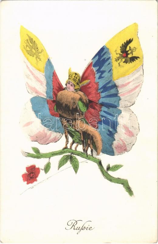 Description: Russie. Editions "Aux Alliés" Paris, Helio L. Géligné No. 25. / Allies of World War I (Entente Powers): Russia. Art Nouveau butterfly lady / Antanthatalmak az első világháborúban: Oroszország. Szecessziós pillangó hölgy
