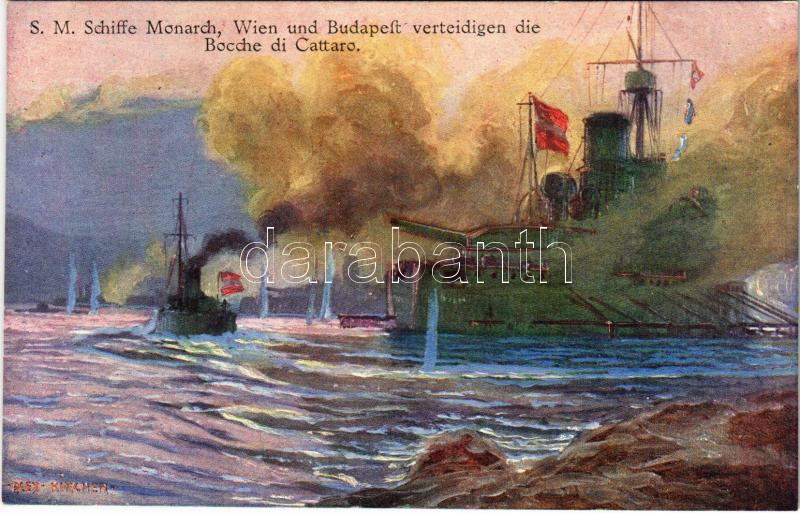 Description: K.u.K. Kriegsmarine SM Schiffe Monarch, Wien und Budapest verteidigen die Bocche di Cattaro. Offizielle Postkarte des Österreichischen Flottenvereines zu Gunsten der Kriegsfürsorge / Austro-Hungarian Navy art postcard, Monarch-class coastal defense ships defending the Bay of Kotor s: Alex Kircher