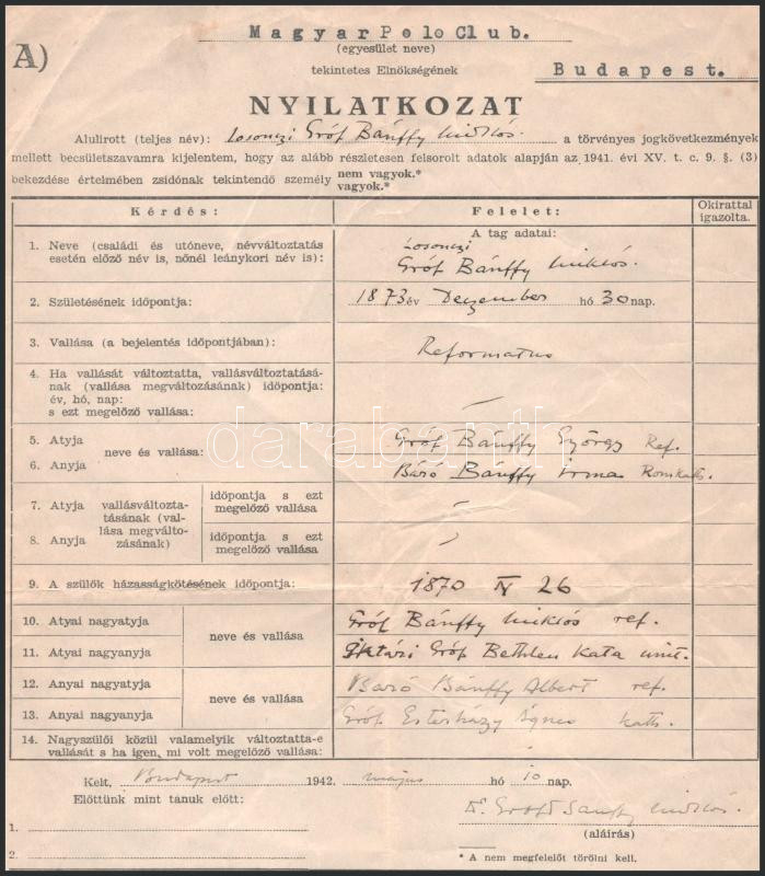1942 Bánffy Miklós (1873-1950) író, külügyminiszter származási nyiltakozata