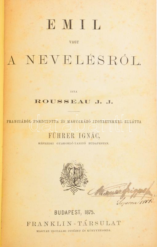 Rousseau, [Jean-Jacques]: Emil vagy a nevelésről. Franciából ford. és magyarázó jegyzetekkel ellátta: Führer Ignác. Bp., 1875, Franklin-Társulat, XI+(1)+582 p. Első magyar kiadás. Korabeli, aranyozott gerincű egészvászon-kötésben, kissé kopottas borítóval, helyenként kissé foltos lapokkal, a címlapon tulajdonosi névbejegyzéssel.