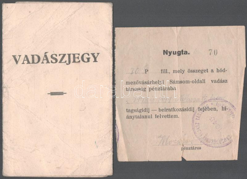 https://www.darabanth.com/en/491-Online-auction/491.0/Art-and-other-collectibles/Documents~500020/1946-Vadaszjegy-fenykep-nelkul-plus-Nyugta-a-Samsom-oldali-vadasz-tarsasag-penztaraba-befi~II3378295
