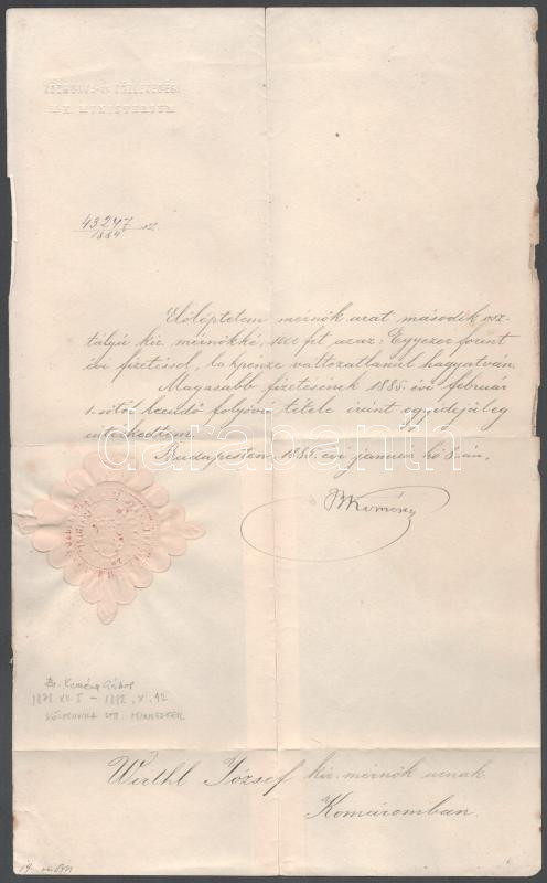 1885 Magyargyerőmonostori báró Kemény Gábor (1830-1888) közmunka- és közlekedésügyi miniszter aláírása fejléces hivatali kinevező okiraton