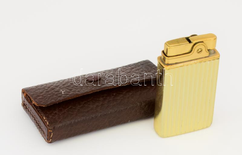 Crown musical öngyújtó, zeneszerkezettel, bőr tokban, h: 6,5 cm
