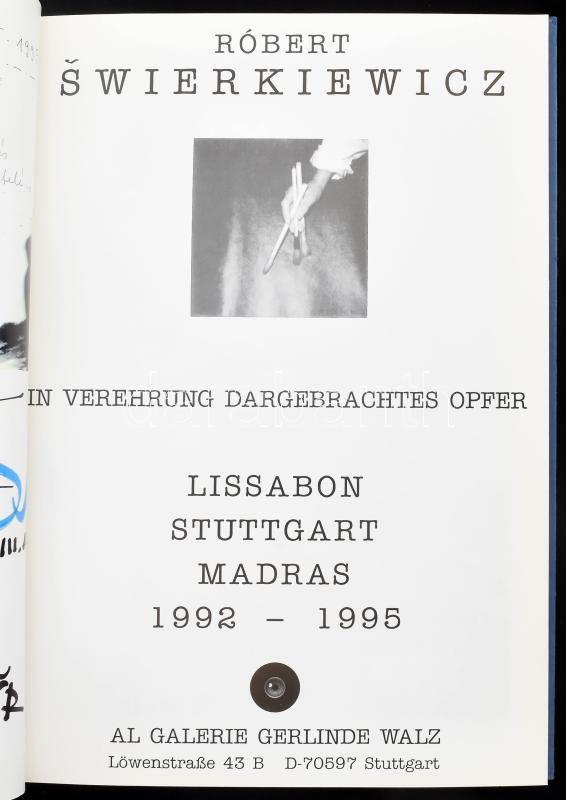 Swierkiewicz, Róbert: In verehrung Dargebrachtes Opfer 1992-1995. Lissabon - Stuttgart - Madras,1995.,Al Galerie Gerlinde Walz. Gazdag képanyaggal illusztrált. Német nyelven. Kiadói papírkötés.