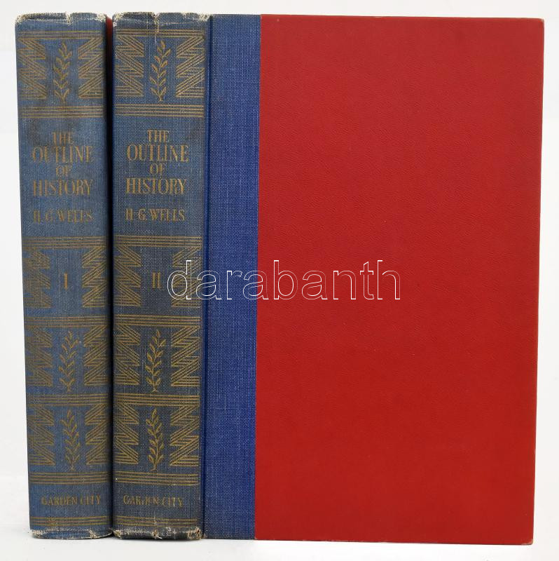 H. G. Wells: The Outline of History. Vol. I-II. Being a plain history of life and mankind by - - -. Revised and brought up to the end of the second world war by Raymond Postgate. With maps and Plans by J. F. Horrabin. New York,1956,Garden City Books. Angol nyelven. Kiadói aranyozott gerincű félvászon-kötések, kissé opott borítókkal, kissé sérült gerincekkel.
