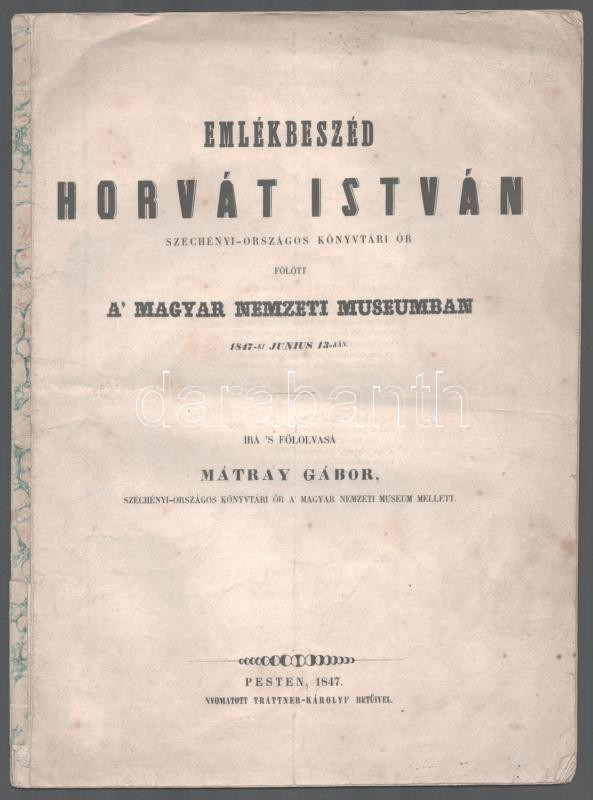 Mátray Gábor (1797-1875): Emlékbeszéd Horvát István Széchényi-Országos könyvtári őr fölött a' Magyar Nemzeti Museumban 1847-ki junius 13-kán. Írá 's fölolvasá - -, ... Pesten, 1847, Trattner-Károlyi, 16 p.