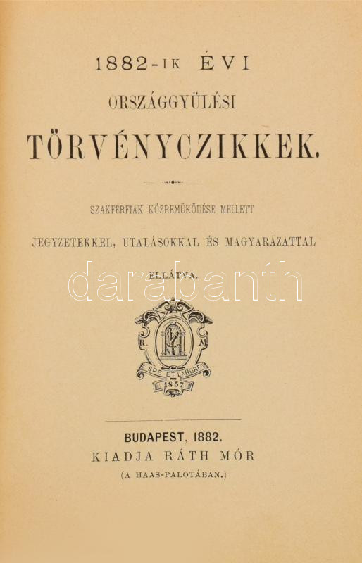 1882-ik évi országgyűlési törvényczikkek. Szakférfiak közreműködése mellett jegyzetekkel, utalásokkal és magyarázattal ellátva. Bp., 1882, Ráth Mór (Hornyánszky-ny.), IX+(1)+716 p. Kiadói aranyozott egészvászon-kötés, kissé kopott, foltos borítóval, belül nagyrészt jó állapotban, egy lap szélén hiánnyal.