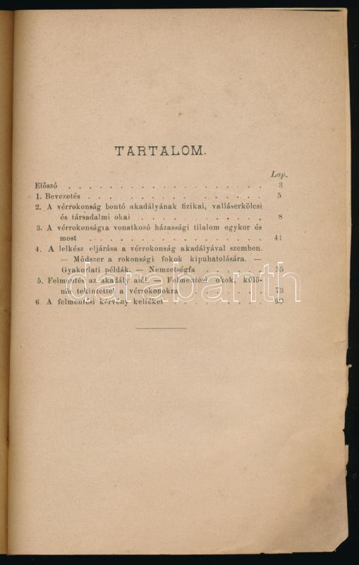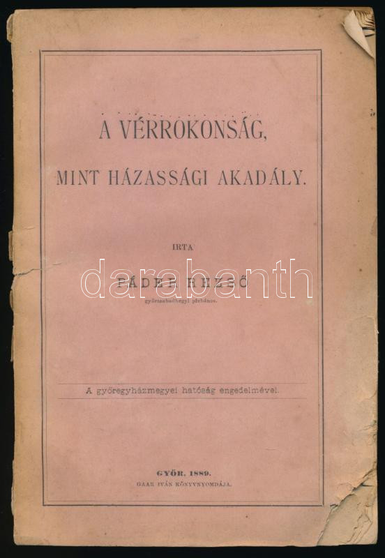 Páder Rezső:. A vérrokonság mint házassági akadály. Győr, 1889. Gaal Iván 97p 2. Néhány lap sarka sérült. Kiadói papírborítóval, ritka.