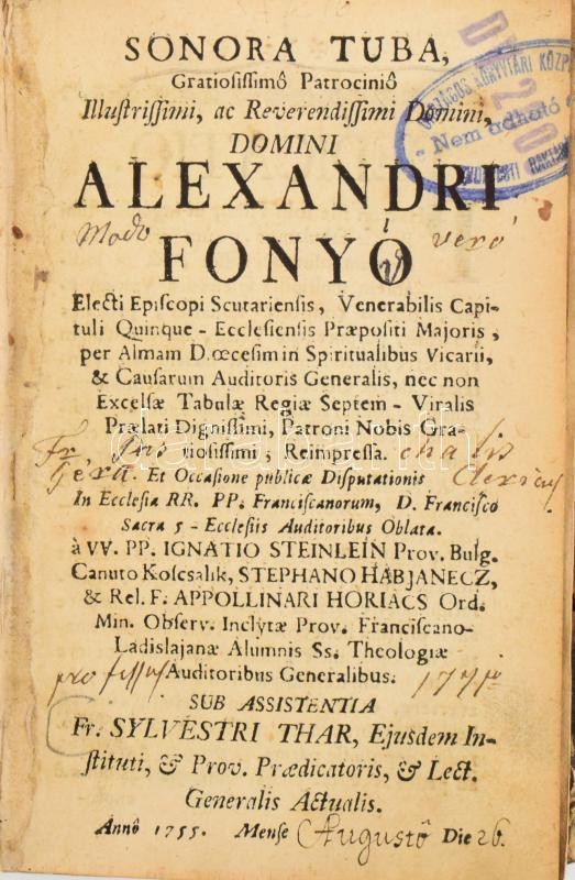 Sonora tuba [...] Aleandri Fonyó [...]. Buda, 1755, Landerer. Egészbőr kötésben, kopottas állapotban.