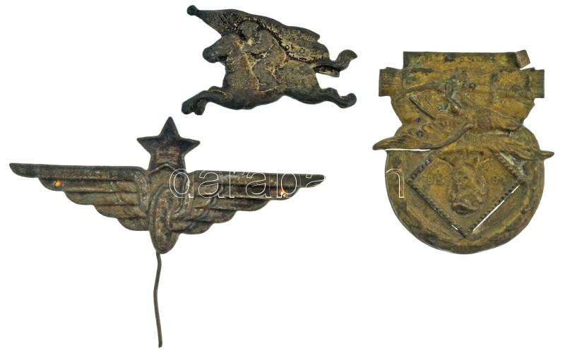 Description: ~1948. "1848" Petőfi Sándor arcképével és Turullal díszített fém lemezjelvény + ~1950-1960. Vasutas bronz lemezjelvény + DN Lovas bronz lemezjelvény T:VF, tű hiányzik, több helyen repedés