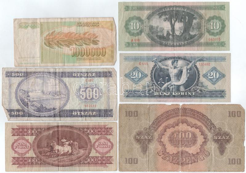 1944. 100P (A Vöröshadsereg Parancsnoksága" + 1969. 10Ft + 20Ft + 1984. 100Ft + 1990. 500Ft + Jugoszlávia 1989. 1.000.000D T:F-G, pici anyaghiány, szakadások