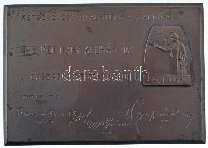 1936. Az Országos Nemzeti Klub ezüstözött bronz plakettje Tasnádi Nagy András a Klub 200. vitaestjének alkalmából. Tasnádi Nagy András (1882-1956; magyar politikus, a református egyház fÅ‘gondnoka. Az Imrédy- és a második Teleki-kormányok idején igazságügyi miniszter. Az 1945 elÅ‘tti képviselÅ‘ház utolsó elnöke, késÅ‘bb háborús bűnöskét Ãtélték el, börtönben hunyt el). "Kétszázadik Vitaesténk Alkalmából - Tasnádi Nagy András-nak - Országos Nemzeti Klub". Eredeti tokban (88x126mm) T:AU,XF