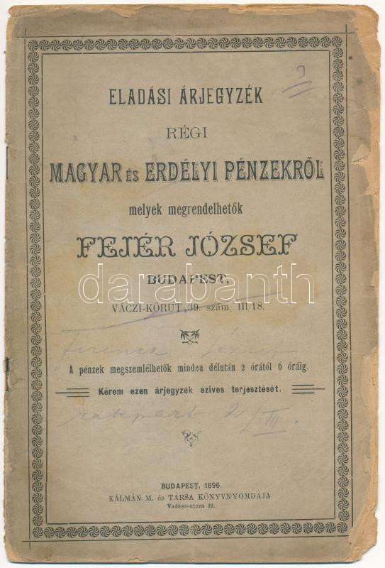 Description: Eladási árjegyzék régi magyar és erdélyi pénzekről melyek megrendelhetők. Fejér József Budapest, Váczi-körút 39. szám, III/18. Budapest, Kálmán M. és Társa Könyvnyomdája, 1896. Viseltes állapotban.