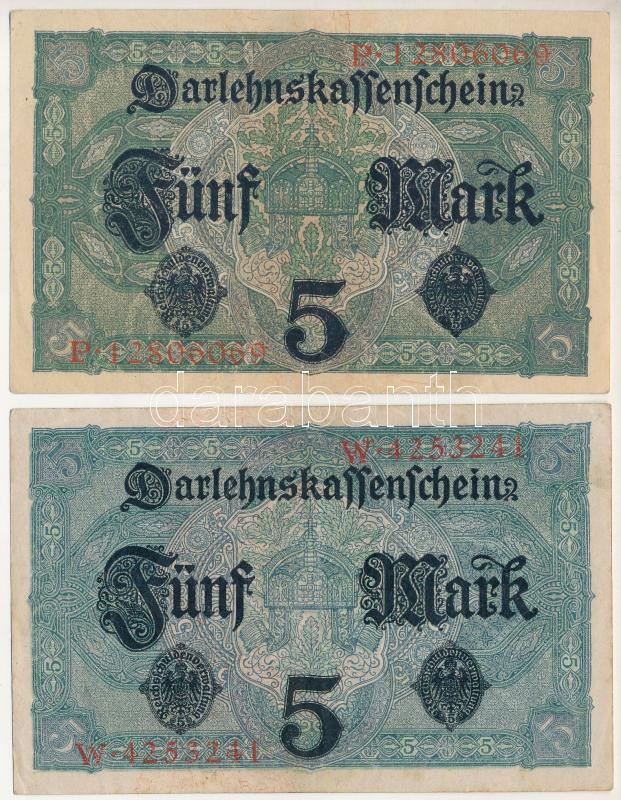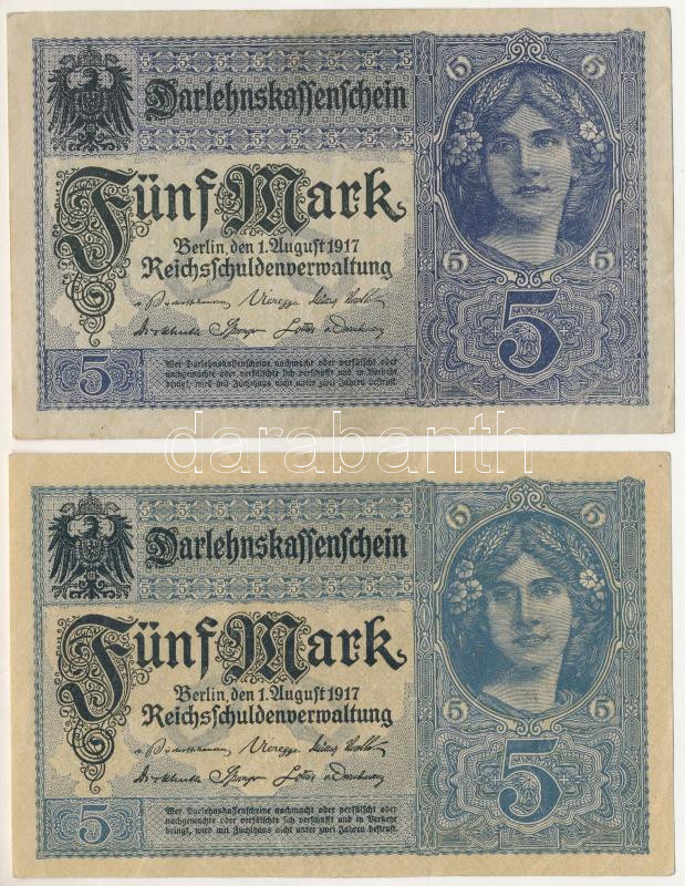 Description: Német Birodalom 1917. 5M (2xklf, egyik hét-, a másik nyolc jegyű sorozatszám) T:F szép papír German Empire 1917. 5 Mark (2xdiff, one with 7, one with 8 digit serial) C:F fine paper Krause P#56