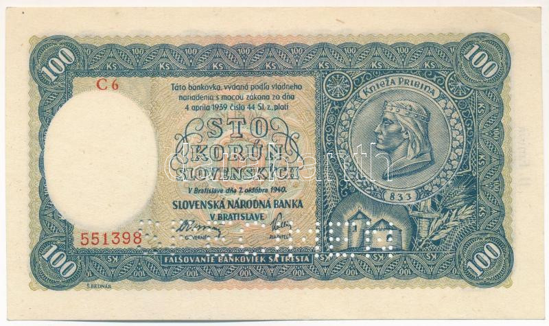 Szlovákia 1940. 100K II. kiadás, "SPECIMEN (MINTA)" perforác...