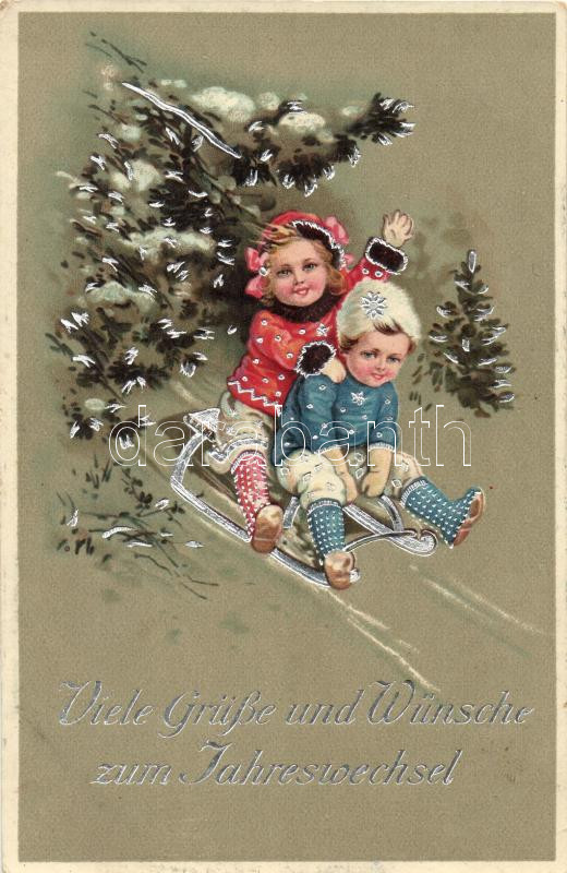 New Year, sledging children, HWB Ser. 4528. silver decoration, litho (...