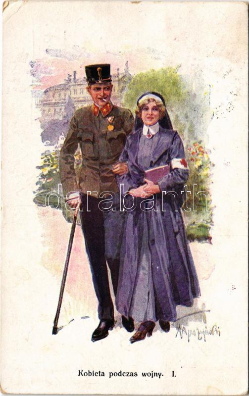 1917 Kobieta podczas wojny / WWI K.u.K. military art postcard, disabled officer with Red Cross nurse. A.F.W. III/2. Nr. 731. s: Tuszynski (EK)