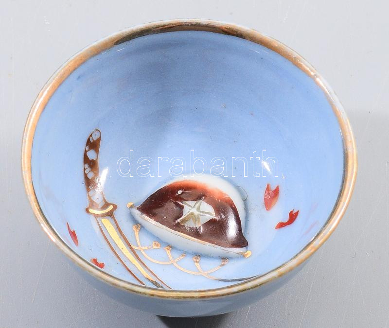 Japán porcelán katonai szakés csésze. cca 1940-1944, gyalogos hadosztály, katana és sisak díszítéssel, kopással, d: 5,5 cm