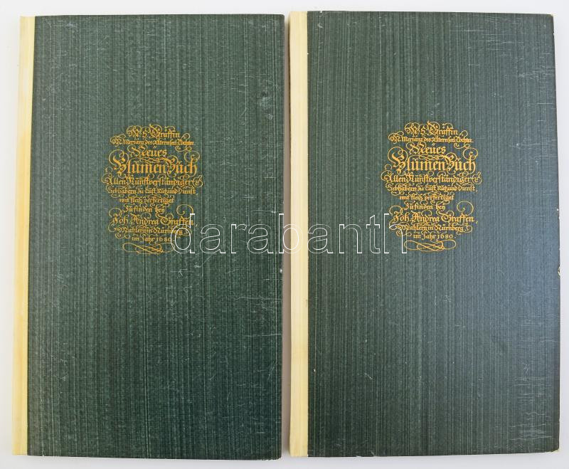 Merian, Maria Sibylla: "Neues Néumenbuch." I-II. Bände. I. Band: Neues Blumenbuch. Allen Kunstverständigen Liebhabern zu Lust, Nutz und Dienst, mit Fleiß verfertiget zu finden bey Joh. Andrea Graffen, Mahlern in Nürnberg im Jahr 1680. II. Band: Helmut Deckert: "Maria Sibylla Merians "Neues Blumenbuch" (Nürnberg 1680.) Begleitext zur Faksimileusgabe nach dem Exemplar der Sächsischen Landesbibliothek zu Dresden. Leipzig,1966,Insel-Verlag, 6 p.+2-12 t.+12 t.+12 t.; 71+1 p. Erste Ausgabe. Fakszimile kiadás. Német nyelven. Színes metszetek reprodukcióival. Kiadói aranyozott félpergamen-kötések, kopott, sérült kiadói kartontokban, kopott borítókkal. egyébként jó állapotban.