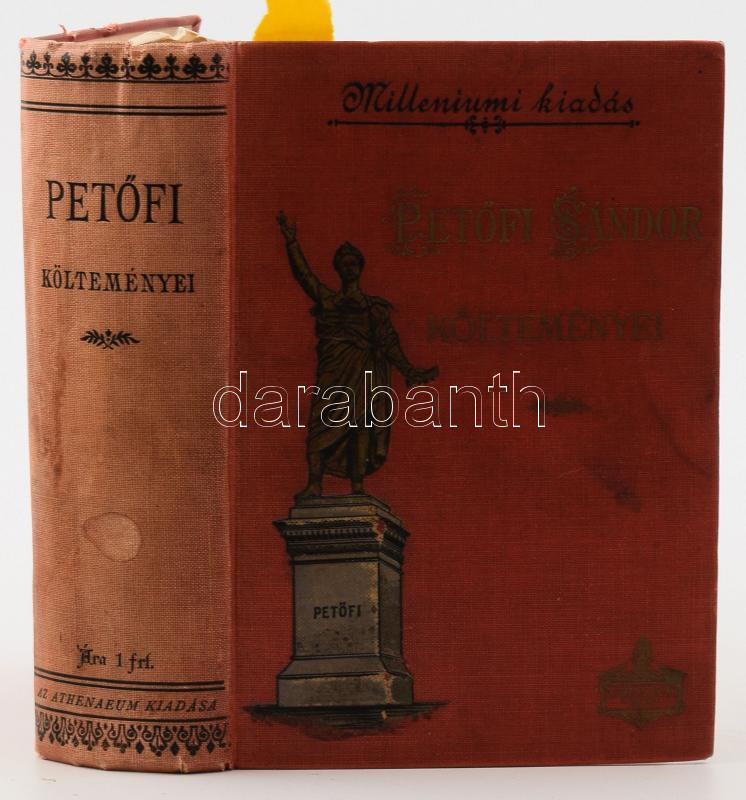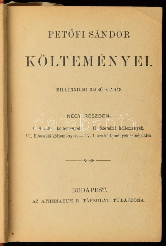 Petőfi Sándor költeményei. Millenniumi olcsó kiadás. Bp.,1896, Athenaeum. Kiadói aranyozott egészvászon-kötés, Gottermayer-kötés, kopott, foltos borítóval.