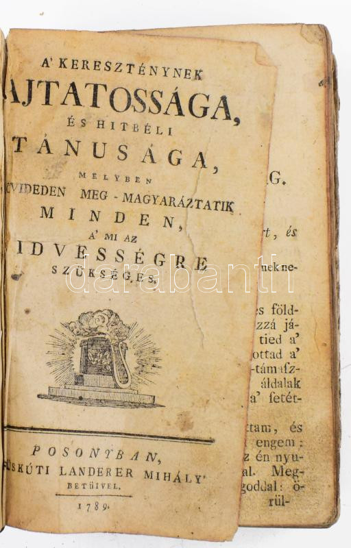 Description: A keresztyének ájtatossága és hitbéli tánusága, melyben röviden meg-magyaráztatik minden a' mi az idvességre szükséges. Pozsony, 1789, Füskúti Landerer Mihály. Bordázott gerincű sérült bőr kötés, foltos lapok, viseltes állapotban.