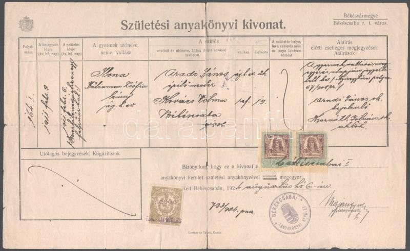 https://www.darabanth.com/en/493-Online-auction/493.0/Foreign-philately-and-postal-history/Documents~1000016/1924-Teljes-szuletesi-anyakonyvi-kivonaton-Bekescsaba-10000K-varosi-illetekbelyeg-elcsuszott~II3385954
