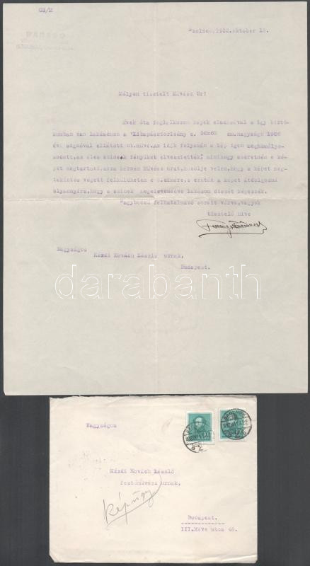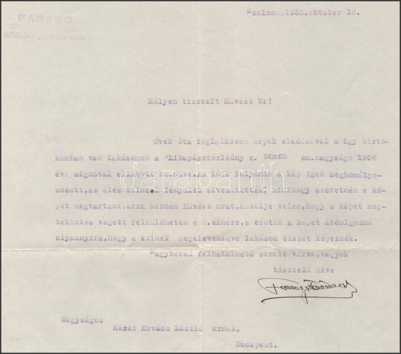 Description: 1933 Szolnok, Faragó Sándor műkereskedő, könyv és papíráruház tulajdonos levele Kézdi-Kovács László (1864-1942) festőművész, műkritikushoz, amelyben Faragó a tulajdonában lévő Kézdi-Kovács László festményt küldené vissza restaurálásra. Fél gépelt oldal, Faragó Sándor autográf aláírásával és céges bélyegzőjével, eredeti borítékon Kézdi-Kovács László autográf feliratával.