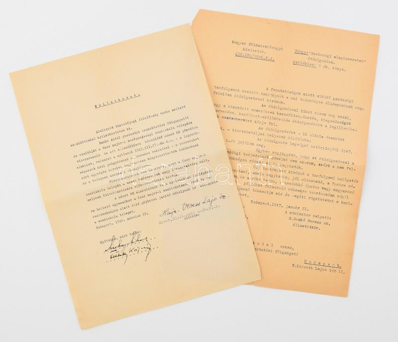 1946-47 Banke Antal író, gazdasági szakoktat kitelepítéséről szóló levél a nyilas időkre vonatkozóan + megbízólevél szakcikk átdolgozására.