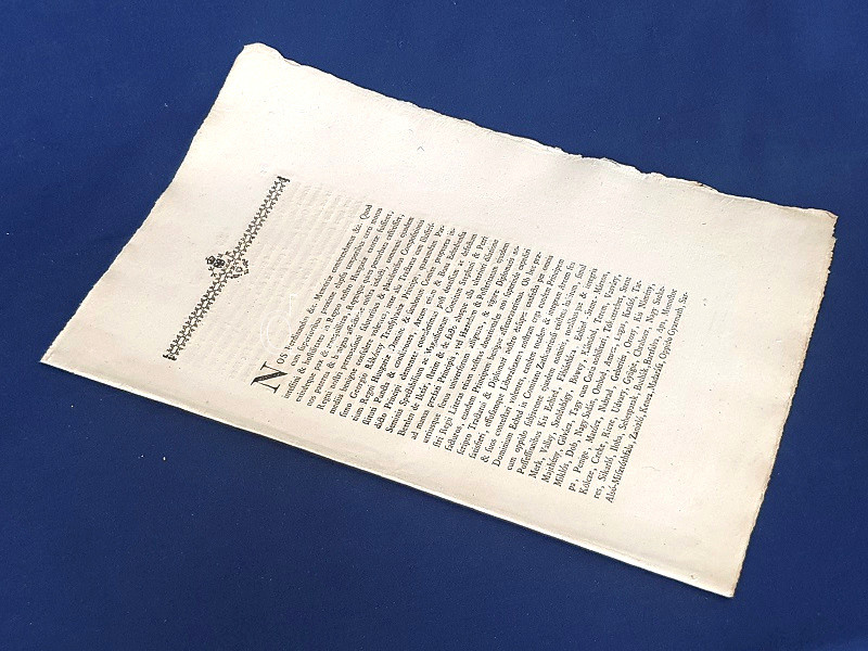 Latin nyelvű nyomtatványunk egy 130 évvel korábbi, 1647-es keltezésű adománylevél nyomtatott okirata. I. Rákóczi György erdélyi fejedelem (ur. 1630-1648) a magyarországi protestánsok védelmében, illetve saját pozíciói erősítése érdekében 1644-ben a svédek és franciák oldalán belépett a harmincéves háborúba, a következő évek során pedig komoly vereségeket mért III. Ferdinánd király (ur. 1637-1657) császári hadaira. A háborúságot lezárandó I. Rákóczi György megkötötte III. Ferdinánd császár-királlyal a linzi békét, mely a hét felső-magyarországi vármegyét (Borsod, Abaúj, Zemplén, Szabolcs, Szatmár, Bereg, Ugocsa) Erdélynek ítélte, néhány, a területen található várral egyetemben. A linzi békekötés után két évvel keletkezett eredeti oklevelünk azért született, mert a szatmári láp erősségét, Ecsed várát és birtokait - a császári-erdélyi hadakozások meghatározó katonai objektumát - a linzi béke a vármegyék váraival szemben nem engedte át, hanem az engedelmesebbnek tartott Bethlen-örökösök számára tartotta fenn; 1647-ben viszont az iktári Bethlen-ág utolsó örököse, Bethlen Péter is elhunyt, így a klauzula elhárulásával az ecsedi erősség végül I. Rákóczi György uralmába került. Az oklevél eredetije 1647. május 7-én, Bécsben kelt. A birtok-adásvételi irat a szatmári-szabolcsi sík számos korabeli helynévi adatát közli. Az első nyomtatott oldalon fametszetű könyvdísz.