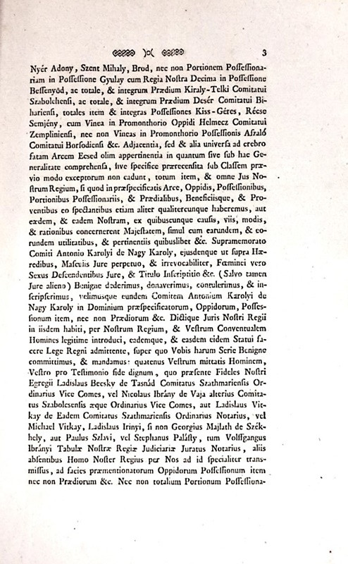 Latin nyelvű dokumentumunk Mária Terézia (ur. 1740-1780) apostoli királynő és császárnő birtokadományozó okirata a Habsburg-dinasztia szolgálatában magát már többször kitüntető, kelet-magyarországi, katolikus főnemes, gróf Károlyi Antal (1732-1791) részére. A szatmári főispáni rang mellett vezérkari és udvari méltóságokat is viselő gróf Károlyi Antal az uralkodónő régi kegyeltje; nyomtatott okiratunkkal Mária Terézia a Károlyi-család birtokába újabb birtoktesteket juttat, melynek jövedelméből az aulikus Károlyi grófok tovább folytathatják katolikus mecenatúrájukat a Habsburg-ház, illetve a katolikus egyház nagyobb dicsőségére. Dokumentumunk az ötödik oldaltól ismeretlen kéz által írt kézírással folytatódik, rajta nyolcvan beírt sorral. Az első nyomtatott oldalon fametszetű könyvdísz.
