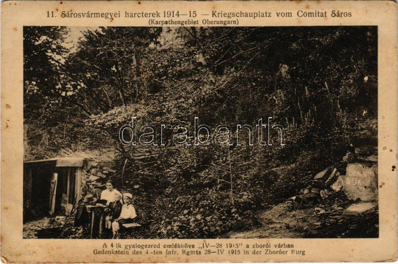 Zboró, Zborov; A 4-ik gyalogezred emlékköve a zborói várban. 11. Sárosvármegyei harcterek 1914-15. / Gedenkstein des 4-ten Infr. Rgmts 28_IV 1915 in der Zboróer, Kriegschauplatz vom Comitat Sáros / WWI military monument (fl)