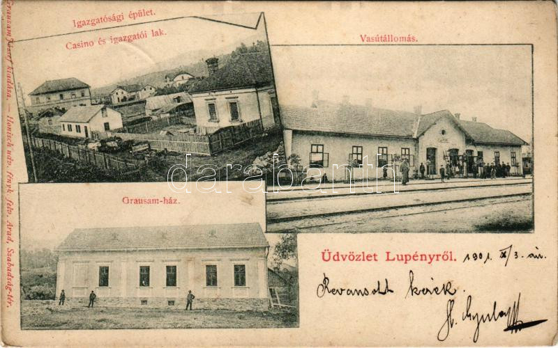 1904 Lupény, Lupeni; Igazgatósági épület, casino, lak, vasútállomás, Grausam ház. Grausam József kiadása, Honisch udv. fényképész felvétele / directorate, casino, railway station. Art Nouveau, floral (gyűrődés / crease)