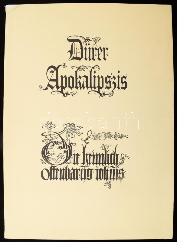 Dürer Apokalipszis. Bp., 1988, KépzÅ‘művészeti Kiadó. Nagy méretű, Dürer metszeteinek reprodukciót tartalmazó könyv. Valamint más metszetek fénymásolataival. Kiadói papÃrkötés, kissé kopott, foltos, kissé sérült kiadói tékában, de alapvetÅ‘en jó állapotban, 49x35 cm.