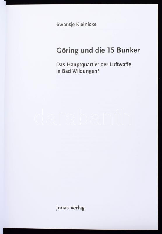 Description: Swantje Kleinicke: Göring und die 15 Bunker. Das Hauptquartier der Luftwaffe in Bad Wildungen? Marburg, 2009, Jonas Verlag. Német nyelven. Fekete-fehér képanyaggal illusztrált. Kiadói papírkötés.