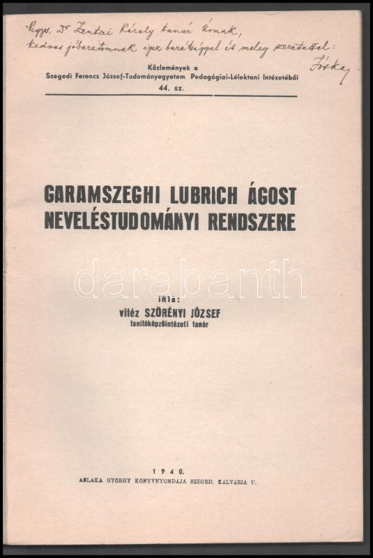 Szörényi József, vitéz: Garamszegi Lubrich Ágost neveléstudományi rendszere. Közlemények a Szegedi Ferencz József Tudományegyetem Pedagógiai-Lélektani Intézetéből 44. sz. A szerző, Szörényi József (1909-2010) erdélyi származású pedagógus, főiskolai tanár által Zentai Károly részére dedikált példány. Szeged, 1940, Ablaka György-ny., 105+(5) p. Kiadói papírkötés, minimálisan sérült gerinccel.