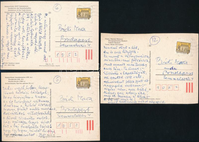 1982 januárja, Keresztury Dezső (1904-1996) költő, korábbi korábbi vallás- és közoktatásügyi miniszter autográf, szellemes verses sorai Bódi Marának, 3 db Balatonfüredről küldött képeslapon, Keresztury Dezső autográf aláírásával. "Mindent elönt a köd, én is csak lötyögök(...)"