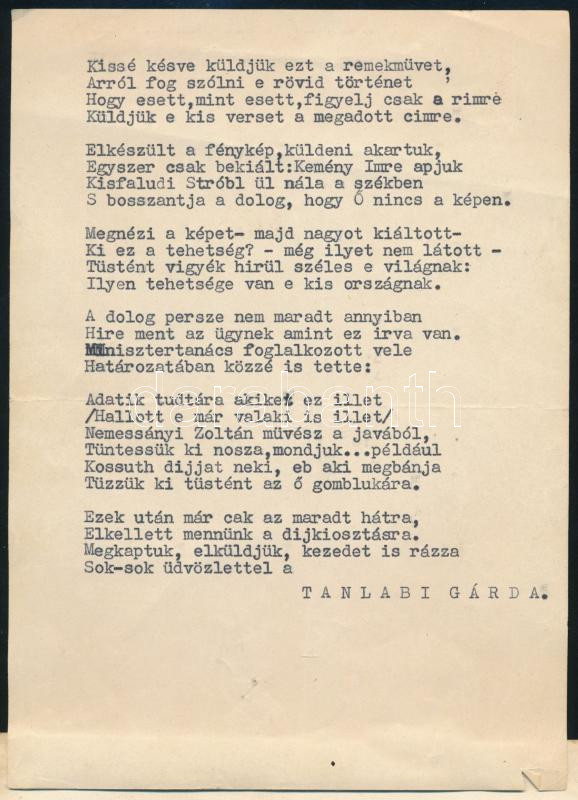cca 1950-1960 A ,,nagy Mesternek"! Hálás tanítványai: Deák István, Váli(?) Ede, Kemény Ferenc (stb.), karikatúrákat ábrázoló fotó, hátoldalán kézzel írt aláírásokkal, valamint gépelt verssel, a fotó szélén sérülésekkel, 17x24,5 cm