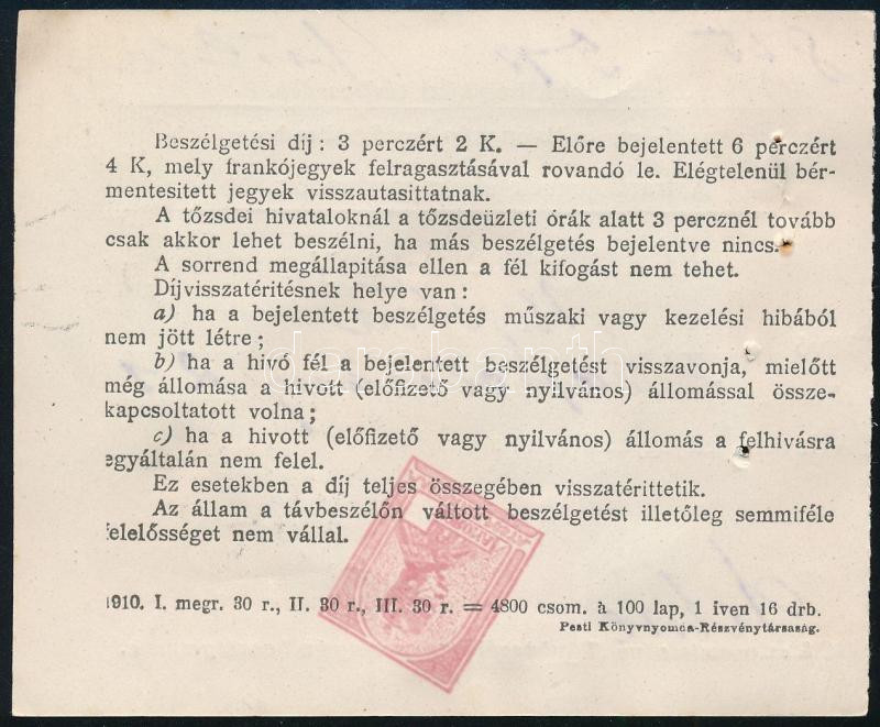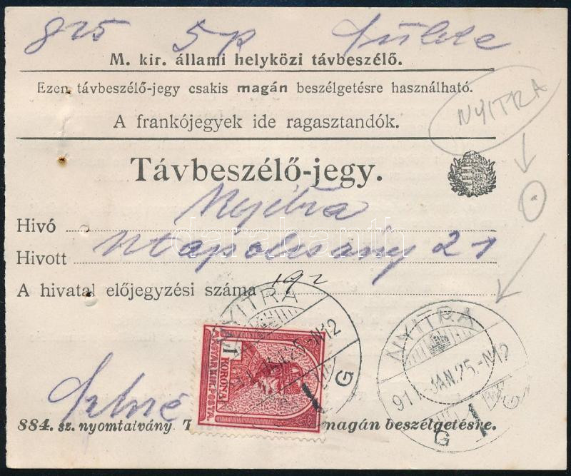 1911 Távbeszélőjegy Turul 1K bélyeggel