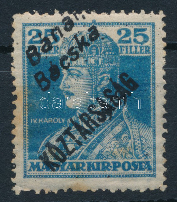 https://www.darabanth.com/en/496-Online-auction/496.0/Hungarian-philately-and-postal-history/Occupation-and-local-issues-1919-1921-with-guarantee~1000047/Banat-Bacska-1919-Karoly-25f-elcsuszott-felulnyomassal-rozsda-Mi-22-with-shifted-overprin~II2867042