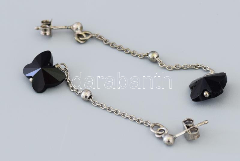Ezüst(Ag) fekete köves pillangós fülbevalópár, jelzés nélkül, h: 5,5 cm, bruttó: 2,6 g
