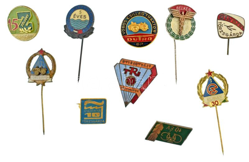 10xklf "Törzsgárda" jelvényből álló tétel, közte zománcozott darabok, közte: Belkereskedelem, Vízügy, Mezőgazdasági Gépjavító, GAG, Gyárépítő, Zöldért, Vörös Csillag Traktor - Dutra Bp., Út-Vasút, Nyíregyházi TRI, ELMAX T:AU,XF közte sérült