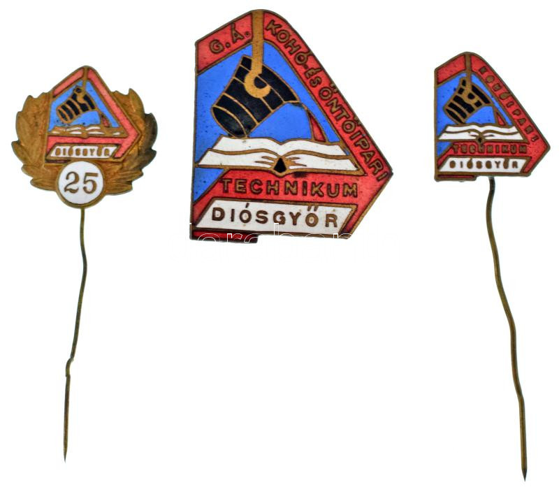 1950. "Gábor Áron Kohó- és Öntőipari Technikum Diósgyőr" zománcozott bronz iskolajelvény (24x28mm) + 2xklf kitűző T:AU,XF