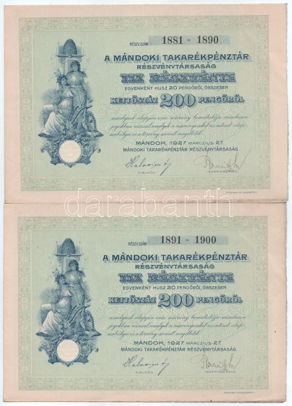 https://www.darabanth.com/en/496-Online-auction/496.0/Numismatics/Shares-and-Tickets~1500006/1927-Mandok-3Cem3EMandoki-Takarekpenztar-Reszvenytarsasag3Cem3E-tiz-reszvenye-egyenkent~II3084290