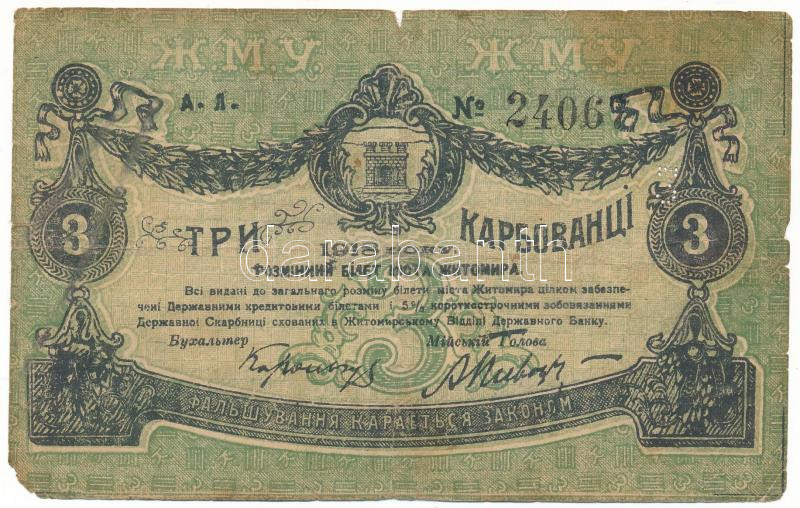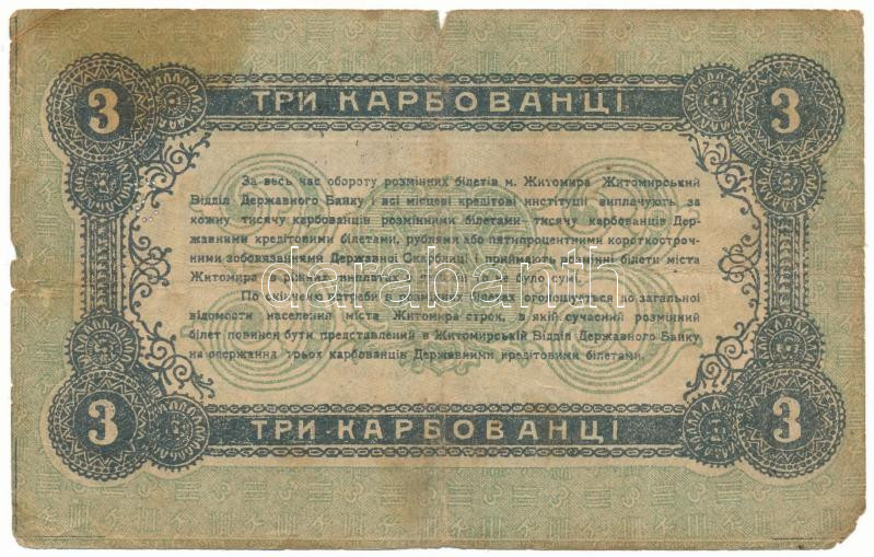 Description: Orosz Polgárháború / Ukrajna / Zsitomir 1918. 3K fekete sorszámmal, perforációval T:VG Russian Civil War / Ukraine / Zhytomyr 1918. 3 Karbovantsiv with black serial and perforation C:VG