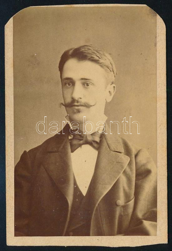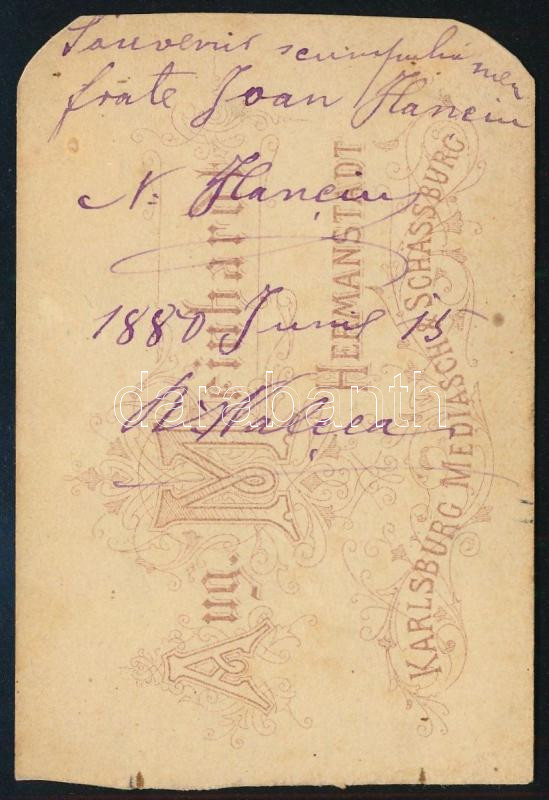1880 Férfiportré, hátoldalán román ny. dedikációval testvére részére és olvashatatlan névvel, keményhátú fotó August Meinhardt erdélyi (Hermannstadt/Nagyszeben, Karlsburg/Gyulafehérvár, Mediasch/Meggyes, Schässburg/Segesvár) műterméből, felső sarkaiban vágott, 10×6,5 cm