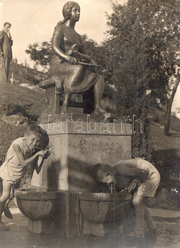 Cca 1931. Budapest, Gellérthegy. Kallós Ede II. világháborúban elpusztult gellérthegyi Hamupipőke-kútszobrának eredeti fényképe. A szobor a Szent Gellérthegy déli oldalán levő gyermekjátszótéren volt látható.