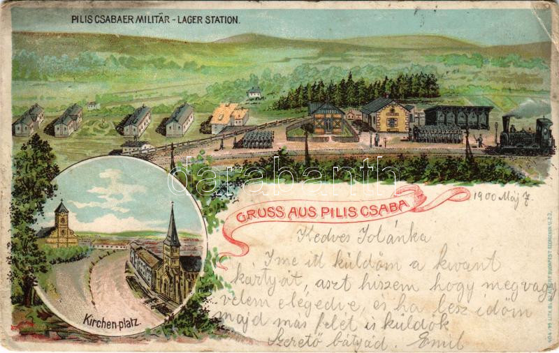 1900 Piliscsaba, tábori vasútállomás, gőzmozdony, vonat, Templom tér. Blau Albert Art Nouveau, litho (EK)