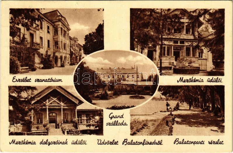 Balatonfüred, Erzsébet szanatórium, Mezökémia dolgozóinak üdülői, Grand szálloda, Balaton-parti részlet (Rb)