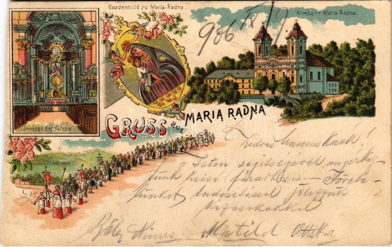 1906 Máriaradna, Mária-Radna, Radna (Lippa, Lipova); Kirche, Gnadenbild, Inneres der Kirche / kegytemplom, kegykép, belső, körmenet / pilgrimage church, interior, procession. Art Nouveau, floral, litho + "GYULA-FEHÉRVÁR - BUDAPEST 6. SZ." vasúti mozgóposta bélyegző (vágott / cut)