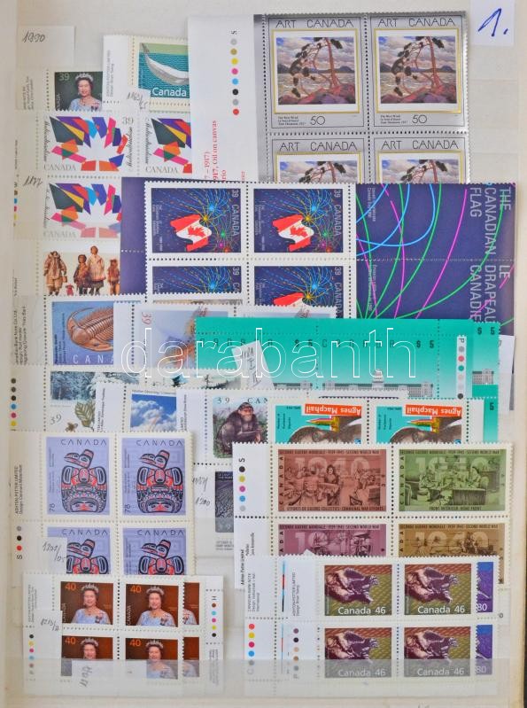 Kanada gyűjtemény 1979-1990 sok összefüggéssel, négyestömbökkel 6 lapos A4-es berakóban (~Mi EUR 1.300,-, magas névérték!!)